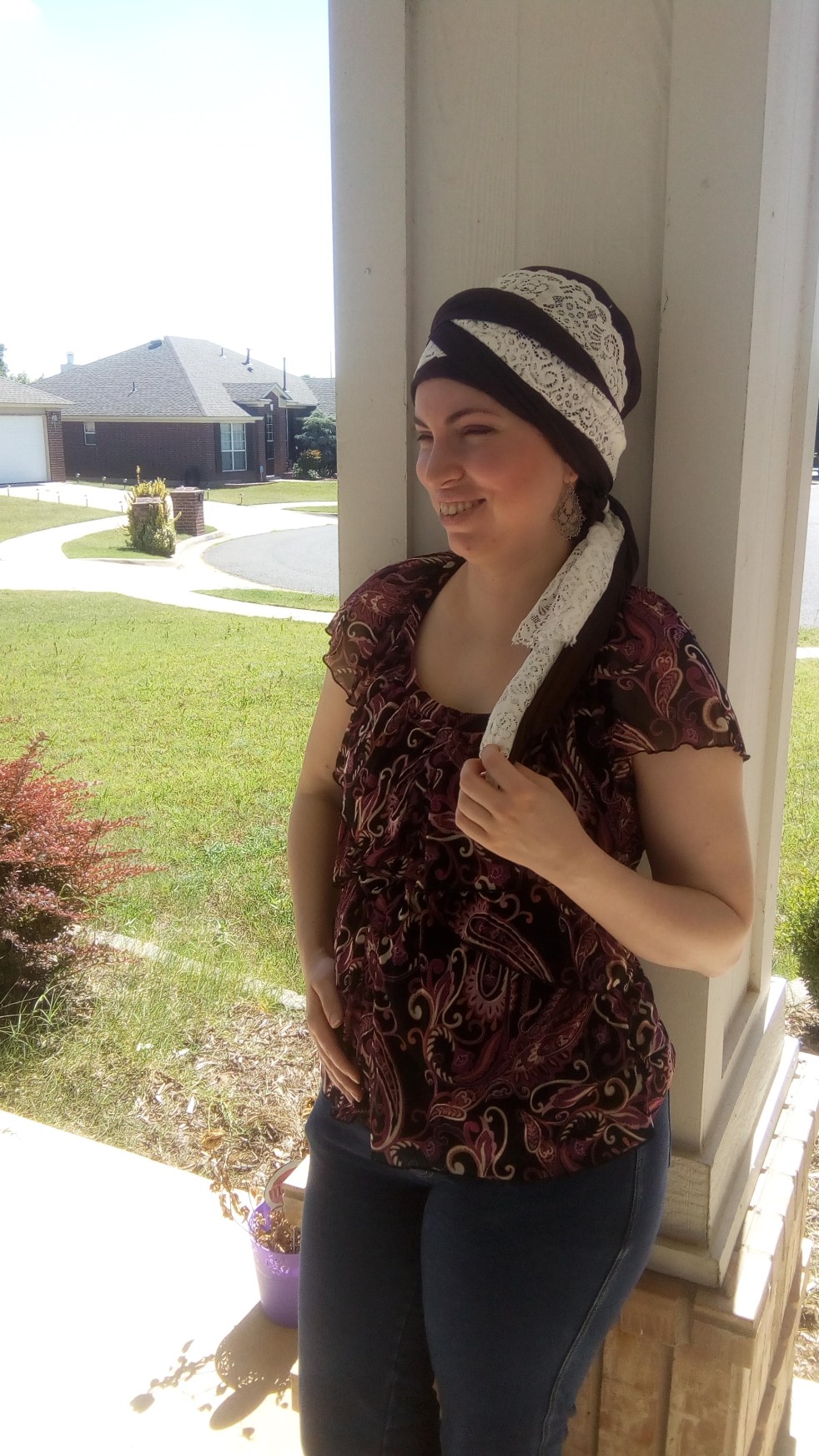 I’m really liking this veil wrap with a tail. It’s actually a very lightweight and cool wrap for a hot day! But it is still too hot to take Bella for a walk. 92 degrees at 9:50 in the morning 😦